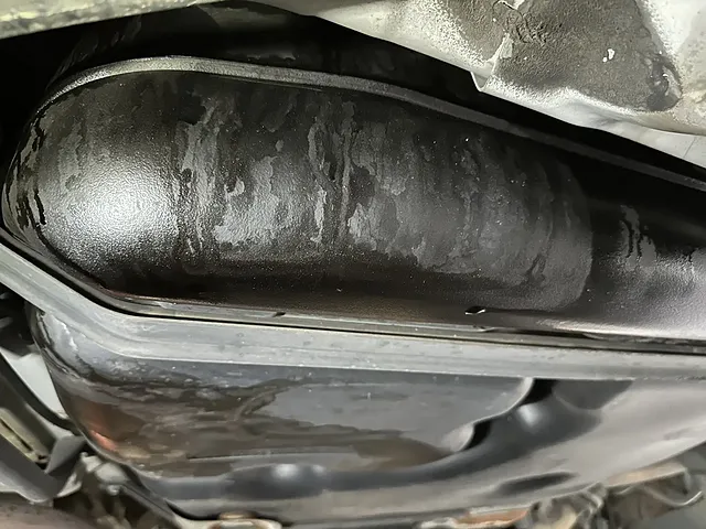 車の下をのぞき込むと燃料タンクがガソリンで湿っています。