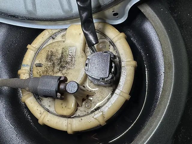 リヤシートを外してサービス用の蓋を外すと大量にガソリンが漏れている状態。