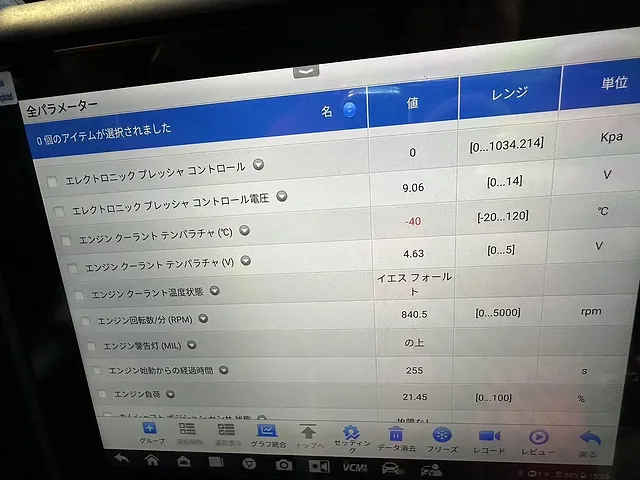 そこでデータモニタの値を調べていくと時間とともにエンジンが温まり水温センサーの数値が上がっていくのですが60度を超えたあたりでマイナス40度に数値が変化して電動ファンが高速で回ってしまうことがわかりました。